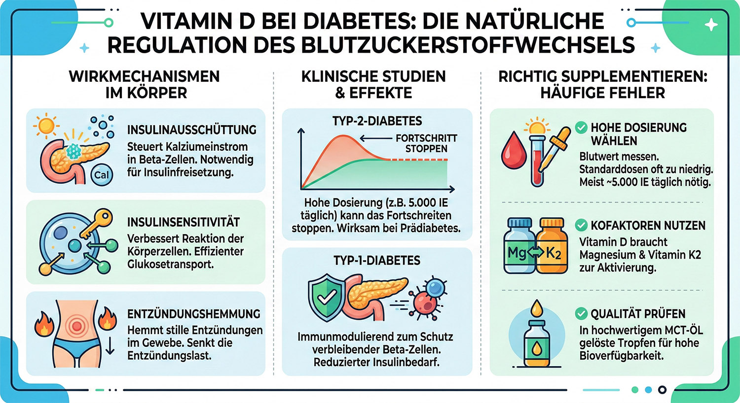 Dieser Artikel analysiert nüchtern und faktenbasiert, wie Sie durch dieses Hormon den Blutzuckerstoffwechsel regulieren, Diabetes Typ 2 stoppen können und welche Dosierungen tatsächlich messbare Ergebnisse liefern. Er dient Ihnen als umfassender Guide für Vitamin D bei Diabetes.