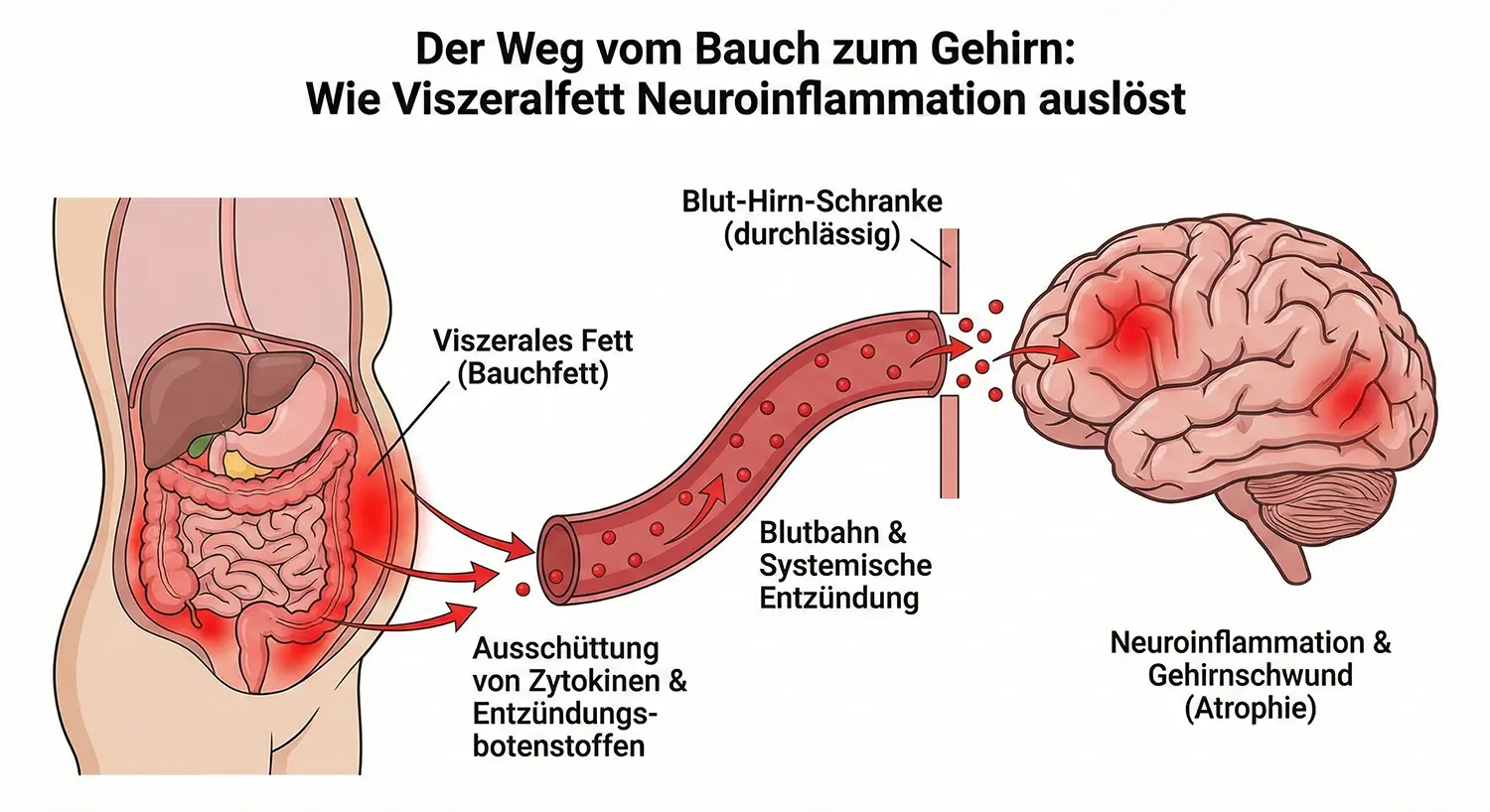 Wie aber greift das Fett im Bauch das Gehirn physisch an? Die entzündlichen Botenstoffe des Viszeralfetts machen vor der Blut-Hirn-Schranke nicht halt. Sie dringen in das zentrale Nervensystem ein und lösen dort eine sogenannte Neuroinflammation aus – einen lodernden, stillen Flächenbrand direkt im Gehirn.