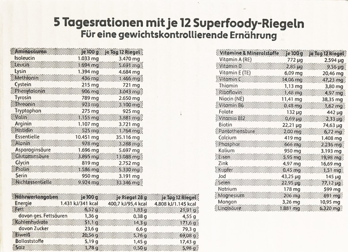 Jede Box enthält 5 Tagespakete, jeweils mit 12 Riegeln pro Tag – ausreichend für eine Woche (bei 5-Tagespaketen). Eine Nutzung über 20 Tage sollte nur nach Rücksprache mit dem Arzt erfolgen.